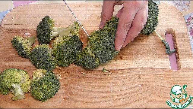 Пока лук жарится, а картофель варится разбираем на соцветия промытую капусту брокколи.