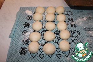 Тесто делим на 15 частей. Каждый кусочек подкатываем и оставляем отдохнуть на 15 минут.