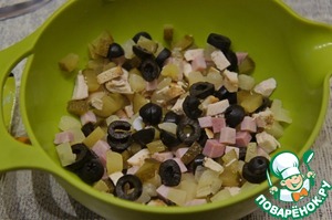 Куриное мясо и окорок нарезать кубиками или соломкой. Добавить нарезанные кубиками огурцы.