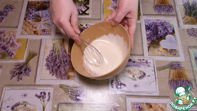 Добавляем воду и растительное масло. При помощи венчика перемешиваем до однородного состояния. Консистенция жидкой сметаны.