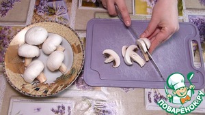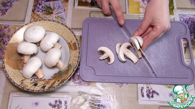 Тем временем очистим и промоем шампиньоны. Обсушим. Нарезаем пластинами по 2-3-мм.
