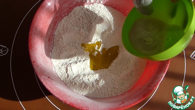 Добавляю соль, оливковое масло, дрожжи, 180 мл воды. -