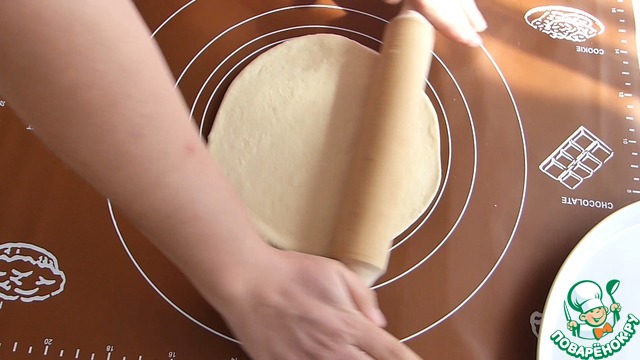 Через 20 минут делим тесто на 2 равных куска, вымешиваем первый кусочек 30 секунд. Раскатываем в круг диаметром 32 см.