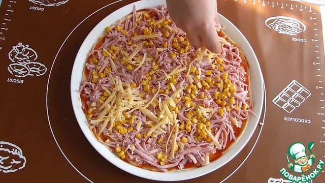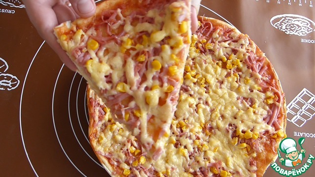 Пицца с докторской колбаской и кукурузой готова. Она получается очень нежная и вкусная, с пикантной сладковатой ноткой).