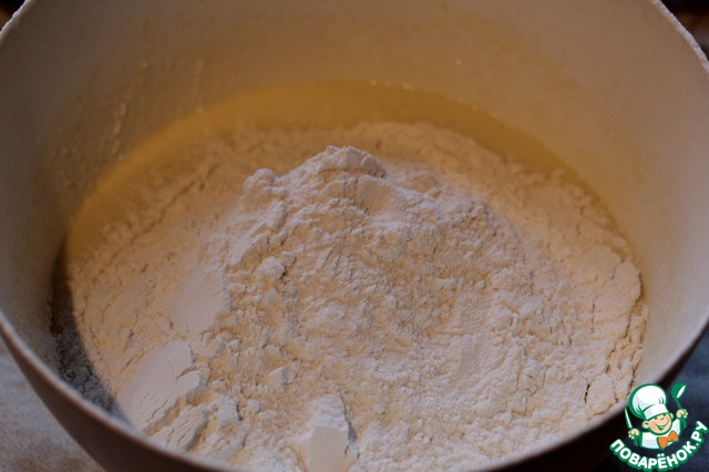 Муку смешать с разрыхлителем и просеять в масляно-яичную смесь, перемешать до однородности.