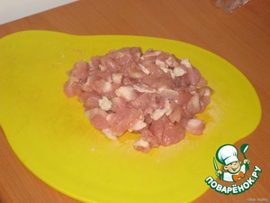 Готовим начинку: куриное филе мелко режем.