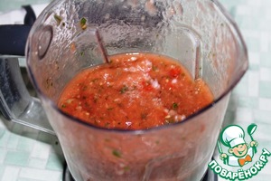 Первым делом приготовим соус. В блендере смешайте помидоры, чеснок, бульон (1 стакан), одну нарезанную луковицу, зелень петрушки (можно кинзы). Хорошо взбейте.