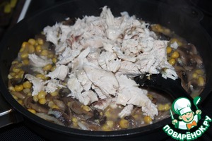 • После того, как грибы станут мягкими, в сковороду добавьте кукурузу, лук и готовьте еще 5 минут.