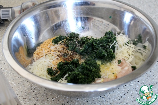 Смешала в миске куриный фарш, шпинат, пармезан, панировочные сухари, чеснок, бульон, яйцо, лук, добавила соль и перец. Оставила постоять минут 10, чтобы сухари впитали жидкости побольше и проще было готовить дальше. Хорошо вымесила.