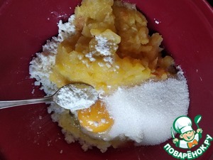 К творогу добавить яблоки, яйцо, сахар, разрыхлитель, муку. На этом этапе можно добавить изюм или другие наполнители.