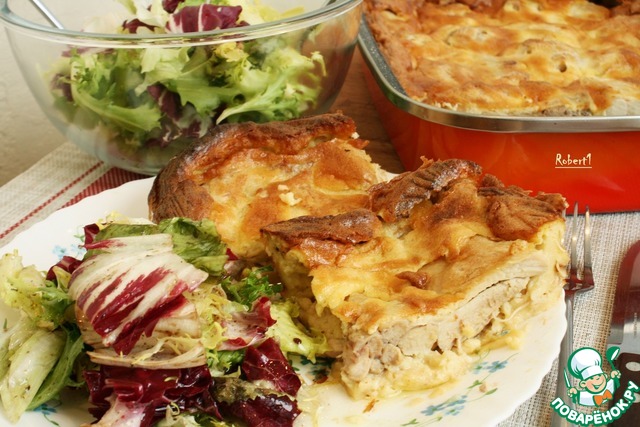 Интересный и вкусный пирог из курицы. Нежное тесто и сливочная курочка, вместе с зеленым салатом самое походящее сочетание. Рецепт взят из книги Лиляны Бисенич и относится к боснийской кухне.