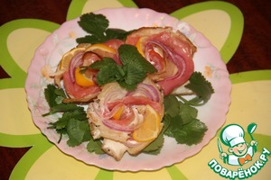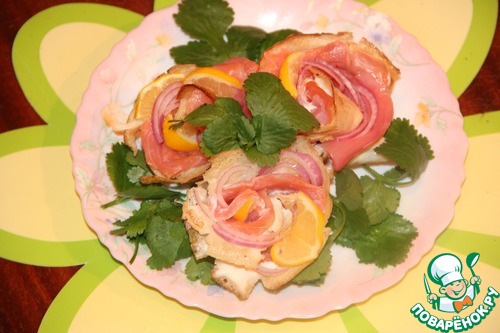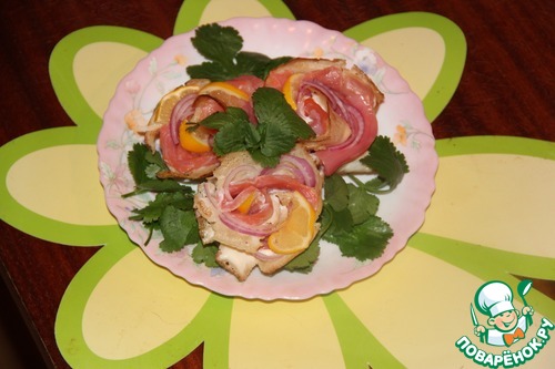 Выложить на тарелочку или блюдо. "Довести до ума". Для этого нарезать лимон и красный лук тоненькими полукольцами и выложить между рыбкой в "розы". Сразу скажу, это не только добавит красоты, но и вкуса.