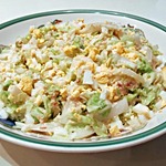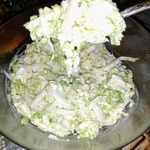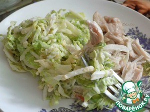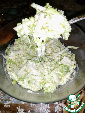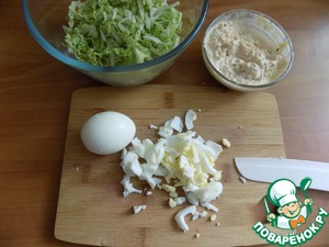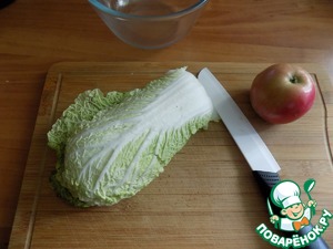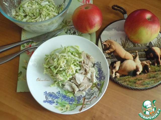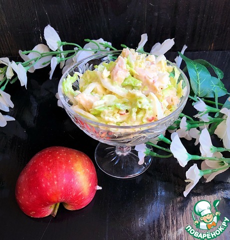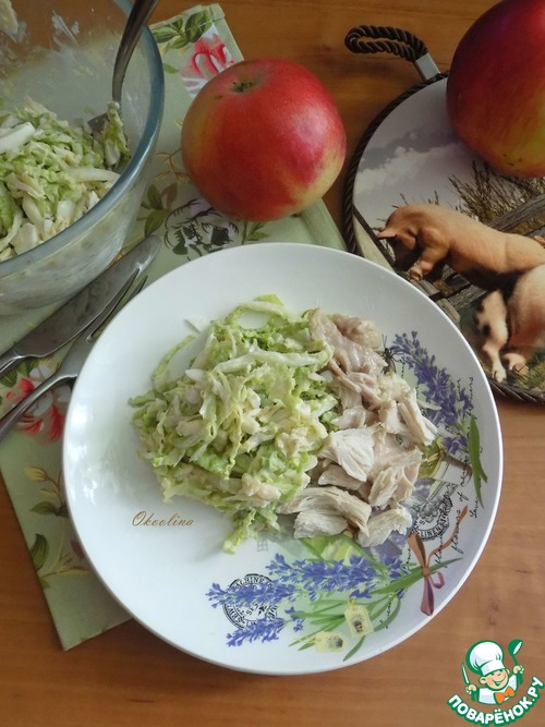 Салат из трёх продуктов - с отличным результатом. Этот салат я начала делать, как только у нас появилась пекинская капуста. Сначала я его делала вообще из двух составляющих: капусты пекинской и яиц. Потом уж, некоторое время спустя, я стала в салат добавлять яблоко - иногда тёртое, иногда нарезанное тонкими пластинками. Можно назвать салатом для лентяев или для быстрого приготовления ужина, нечаянно нагрянувших гостей (тоже подойдёт!)... и т д...