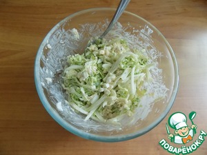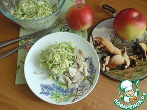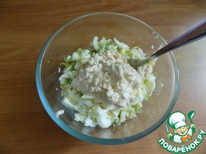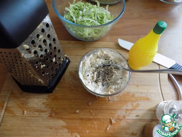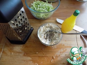 Для заправки натираю яблоко на средней тёрке, поливаю его быстро лимонным соком, перемешиваю, чтобы оно не потемнело. Добавляю майонез, перчу. Опять соединяю, пробую на вкус и немного подсаливаю.