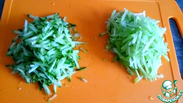 На терке для корейской моркови нашинковать огурец и зеленую редьку.