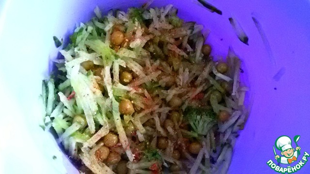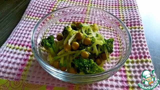 Как большинство овощей, зеленая редька содержит клетчатку — основу здорового питания. Если этот овощ зеленого цвета добавлять в салаты и другие блюда, то насыщение будет чувствоваться значительно дольше. Брокколи- низкокалорийный продукт и поэтому часто применяется в диетическом питании. Достоинство зеленого горошка в том, что он- кладезь легкоусвояемых белков. Огурец является неотъемлемой составляющей повседневного питания. Очень советую приготовить этот зелёный освежающий полезный салат!