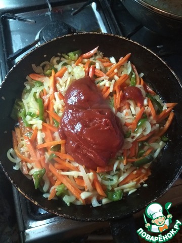 К поджаренным овощам добавляем 3 ст. л. томатной пасты и 1,5 стаканы воды
