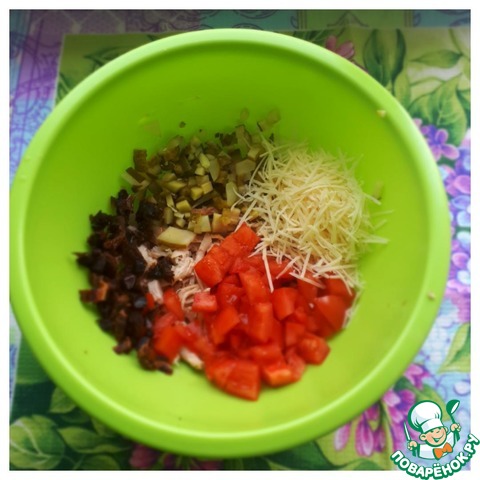 Добавляем заправку в чашку и все перемешиваем, солим и перчим по вкусу.
