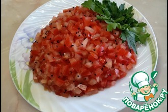 Добавляем в чашку нарезанные кубиком огурцы, сыр пармезан натертый на мелкой терке ( 2 ст. л), финики мелко нарезанные (косточку удалить). Помидоры лучше взять мясистые с небольшим содержанием жидкости, у меня это помидоры на ветке. Их тоже нарезаем кубиком и добавляем к остальныи ингредиентам.