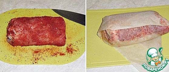 Свернуть мясо в тугой рулет. С внешней стороны немного присолить, обильно обсыпать молотой паприкой со всех сторон получившийся рулет. После этого завернуть в плотный пергамент, как можно туже.