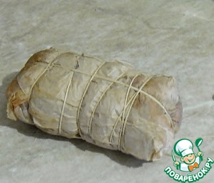 По прошествии двух суток, вынуть рулет из холодильника, подержите его при комнатной температуре. Говорят, что мясо вкуснее, когда его готовят не в холодном виде. Теперь надо снять всю использованную упаковку. Завернуть в новый сухой лист пергамента, обвязать крепкой нитью, чтобы рулет не развернулся при варке.