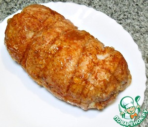 Вынуть пакет с мясом, охладить, снять с него всю упаковку. Слегка обсушить на бумажном полотенце. Получился вот такой симпатичный рулетик.
