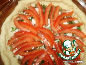 Часть теста раскатать и выложить в форму для запекания, сверху выкладываем нарезанный на тонкие колечки картофель. Солим и перчим.