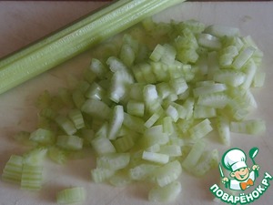Черешки сельдерея очистить и нарезать кусочками. Самые вкусные черешки молоденькие из середины пучка.