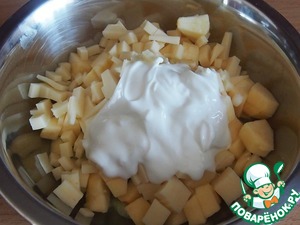 Теперь добавить белый без вкусовых добавок йогурт и все перемешать. Салат вкуснее, когда постоит пару часов, тогда сыр приобретает сладковатый, очень приятный вкус.