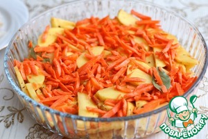 В миску с картофелем добавить 2 ст. ложки растительного масла, добавить специи: смесь прованских трав (1 ч. ложка), лавровый лист (2 шт.), соль, тмин (1 ч. ложка), сладкую паприку (1,5 ч. ложка). Покрыть специями картофель.