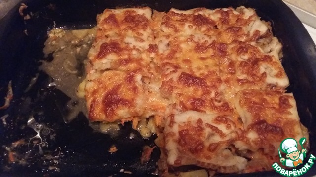 Затем достать форму из духовки, посыпать натертым сыром и отправить вновь в духовку для подрумянивания верхнего слоя на гриле.