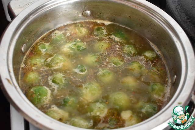 • Размороженную брюссельскую капусту закинуть в кипящую воду на 3 минутки. В моем случае это бульон для будущего супа. И супу хорошо, и капуста вкуснее.