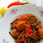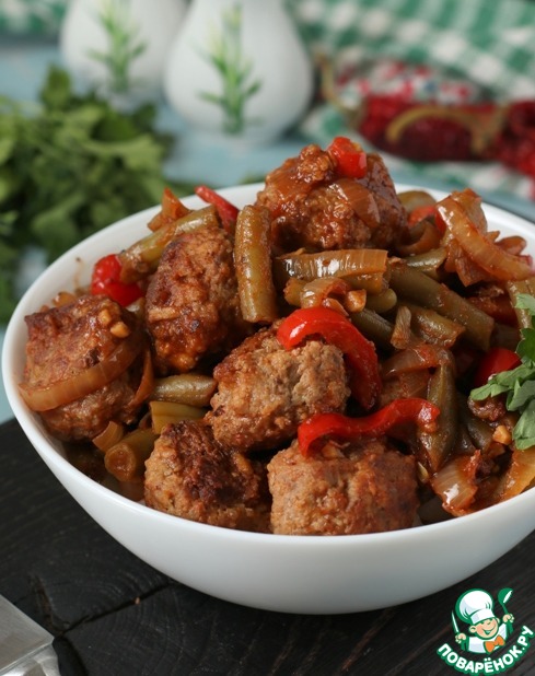 На сковородку, где жарились фрикадельки, выложить нарезанный полукольцами лук. Обжаривать минут 5, затем выложить нарезанный болгарский перец и обжаривать еще минуты 2-3, затем стручковую фасоль и продолжать обжаривать минуты 2-3.