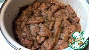 Мясо нарезаем тонкими полосками 1 х 0.5 х 4 см - чтобы быстро прожарилось. Смешиваем все специи, добавляем соль, сахар и оливковое масло для жарки или любое рафинированное растительное масло. Лучше не использовать Extra Virgin оливковое масло или нерафинированные масла - они будут гореть при жарке. Хорошо перемешиваем специи - до получения кашицы и затем равномерно смешиваем с мясом в миске. Приминаем мясо руками и оставляем мариноваться. 30 минут будет достаточно - как раз пока вы делаете все остальное