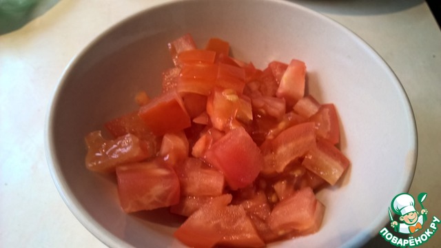 Делаем конкасе из помидора - нарезаем его мелким кубиком - 5 - 8 мм. Если помидор не очень спелый можно подсолить и добавить сахар, но лучше это делать перед подачей - иначе помидоры пустят сок.