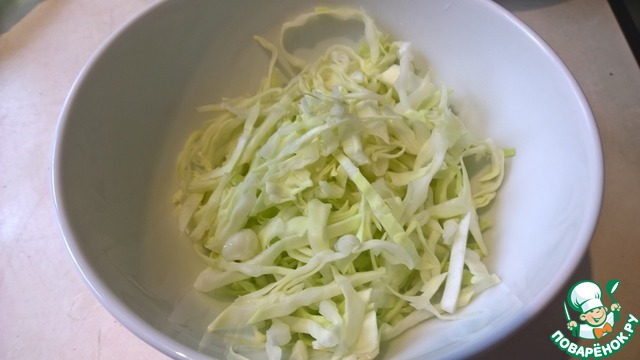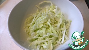 Капустные листья сворачиваем трубочкой (как сигару) и нарезаем шифонадом - тонкой лапшичкой (1 - 3 мм). Так ее легче будет жевать.