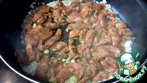 Когда лук немножко обжарится (2 - 3 мин), увеличиваем нагрев до максимального, ждем минуту и добавляем мясо, равномерно распределяя его по сковороде поверх лука. Не перемешиваем - даем обжариться с нижней стороны.
