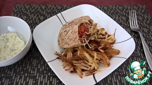 Выкладываем на тарелку гарнир (картофель) а рядом одну или две питы - в зависимости от аппетита. Остатки соуса выкладываем в мисочку и подаем с блюдом.