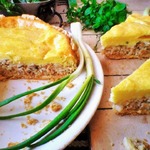 Тесто руками распределяем по дну и стенкам формы (бортики средние делаем, чтобы в центре уместилась начинка, и стараться, чтобы не вытекала заливка), они еще поднимутся при выпечке) диаметр круглой формы приблизительно 24-26 см)