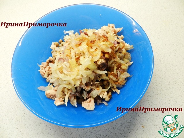 Сверху выкладываем горячий лук вместе с маслом. Перемешиваем.