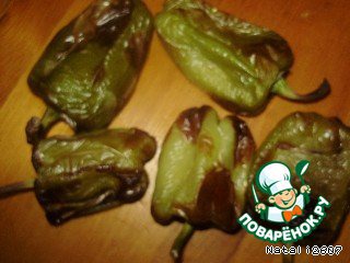 Запекаем болгарский перец в духовке при температуре 200 градусов минут 25. Затем кладем в пакет и завязываем его. Минут через 5 очищаем перец от кожуры.