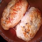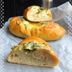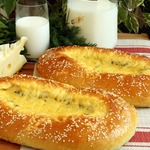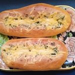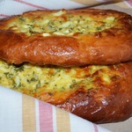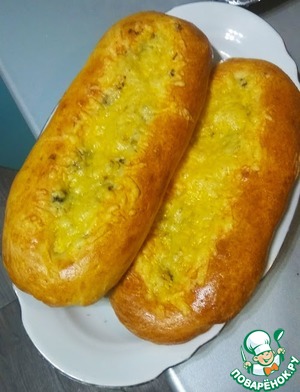 Формируем наши багеты, и даём отдохнуть ещё минут 5-10. После чего продавливаем середину и выкладываем начинку. Поверх посыпаем сыром, натертым на крупной тёрке. Боковушки теста смазываем яичным желтком, разбавленный немного водой.