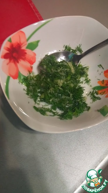Начинка. Чеснок пропустить через чеснокодавилку. Добавить растительное масло и 1 полную столовую ложку зелени и щепотку соли.