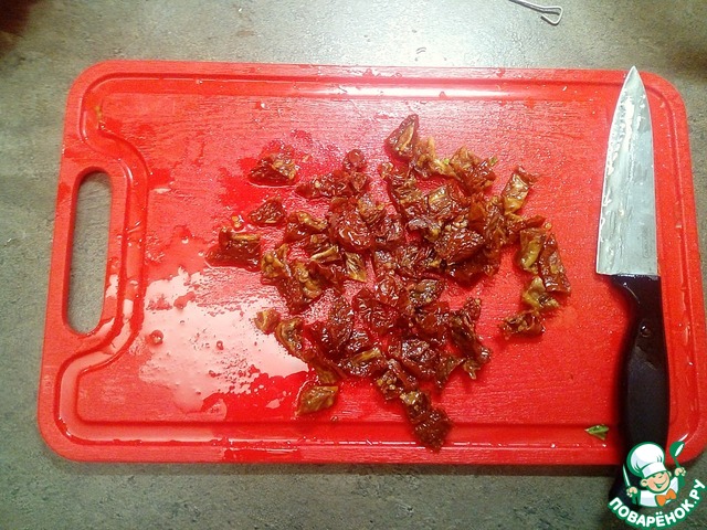 Сушеные (вяленые) помидоры вынимаем из масла и нарезаем половинками/четверти нками - как вам нравится :-)