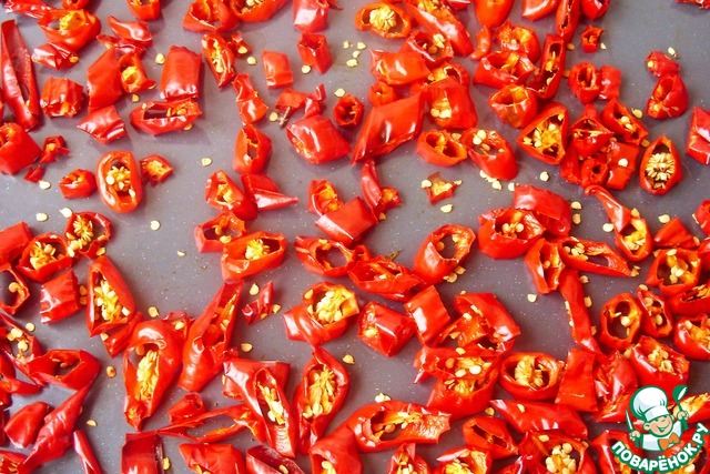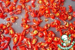 Выкладываем перец на противень и отправляем в духовку. Сушим его при температуре 50-60 градусов до тех пор, пока перец не размягчится и не потеряет заметно в весе. Не стоит излишне пересушивать его. При сдавливании пальцами перец уже не должен выделять сока, но, вместе с тем, должен оставаться довольно мягким.