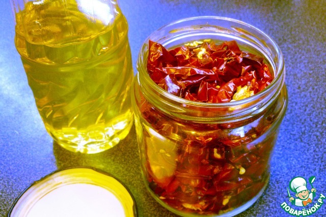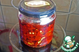 Перец выкладываем в стерилизованную банку (можно выдержать её в духовке 10 мин при 120-150 град. ). Растительное масло прогреваем (прокаливаем) в сотейнике, слегка охлаждаем и заливаем его в банку с перцем.