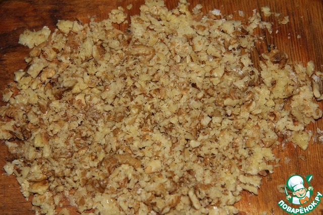 Измельчить грецкие орехи, чтобы были мелкие кусочки (скалкой или ножом), а не до состояния муки.