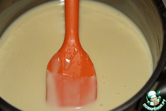 Приготовить крем. Сок апельсина уварить с сахаром до загустения (примерно 20 мин.). Пока, поставить остудить.