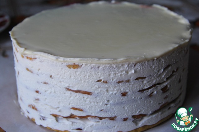 Я собирала торт в кольце с ацетатной пленкой, укладывая коржи и промазывая кремом. Верхний слой покрыть глазурью.