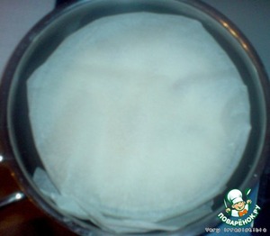 • Форму накрываем пергаментом, ставим в кастрюлю с горячей водой, так чтобы вода доходила до середины формы, накрываем крышкой и держим на среднем огне полтора часа.